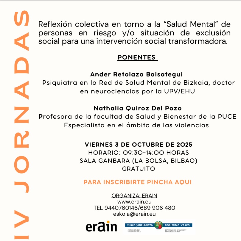 Un año más desde Erain nos complace invitaros a las IV JORNADAS INTERVENCIÓN SOCIAL Y SALUD MENTAL: DETERMINANTES SOCIALES DE LA SALUD MENTAL Y LA VIOLENCIA.