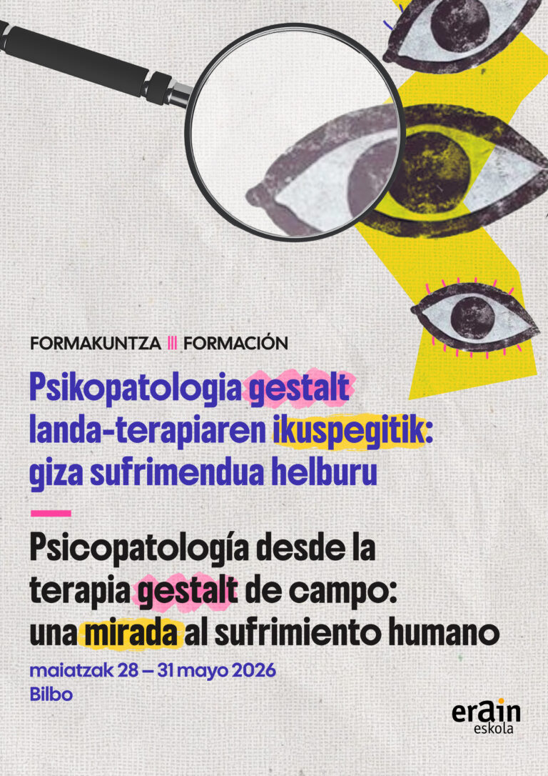 Este curso, impulsado por Erain S. Coop a través de su Escuela de Formación, ofrece herramientas conceptuales y relacionales para abordar la psicopatología desde una concepción integral, encarnada y holística. Una mirada que no separa mente y cuerpo, individuo y entorno, biografía y presente; que no reduce la experiencia a un conjunto de síntomas, sino que busca comprender el sentido de lo que ocurre en el aquí y ahora del contacto. Porque en Gestalt, y especialmente desde la Teoría de Campo, el sufrimiento no es solo algo que “se tiene”, sino algo que se vive, se organiza y se sostiene en la forma particular en que una persona se relaciona consigo misma, con los demás y con su mundo.